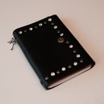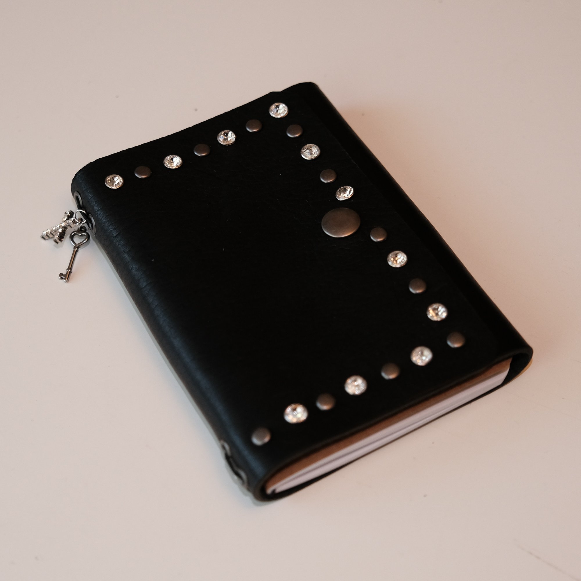 mini 4 x 6 handmade black leather journal cover. fits up to two 4x6 journals or even a passport inside! adorned with a rhinestone cross and key charm.