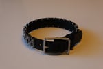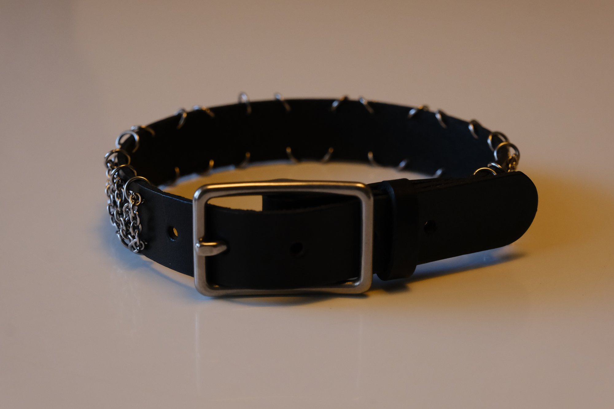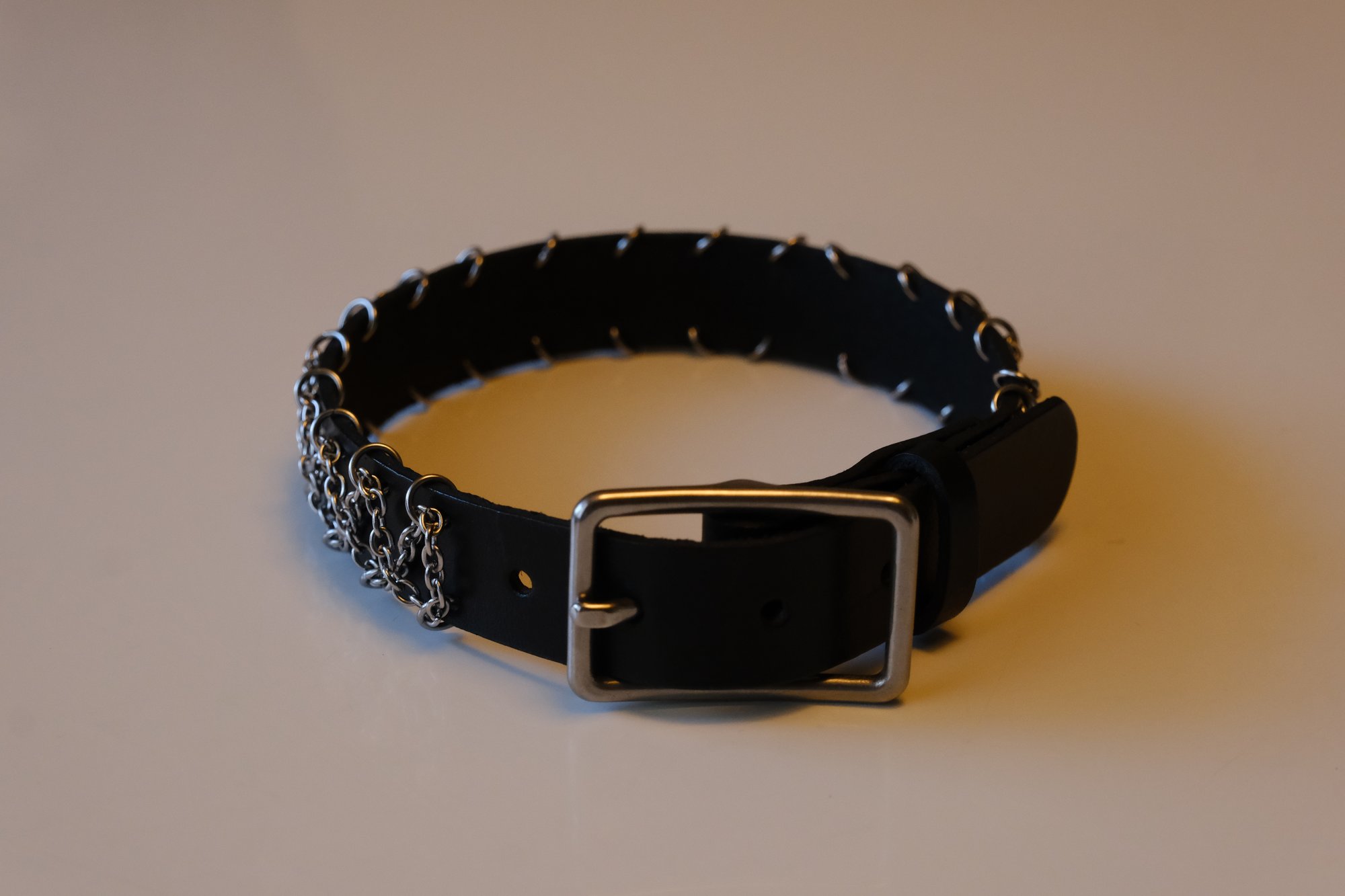 black veg tan leather adorned with stainless steel jump rings and chain laced throughout.