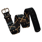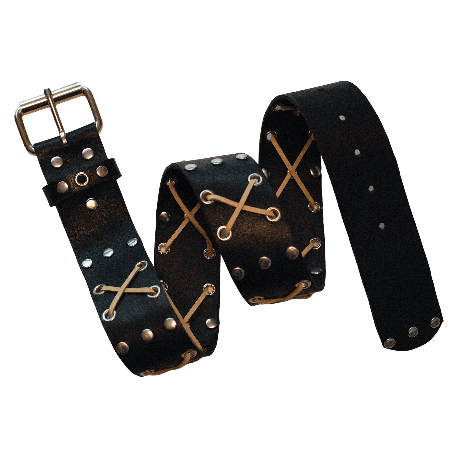 1.75 inch montana leather 5 oz belt adorned with rivets, eyelets and your choice of black suede or cream lace. texture may vary as it is cut out of a large leather hide. intended to be worn low rise. please measure your waist/hip before ordering to ensure a perfect fit. sales final as each piece is made to order.